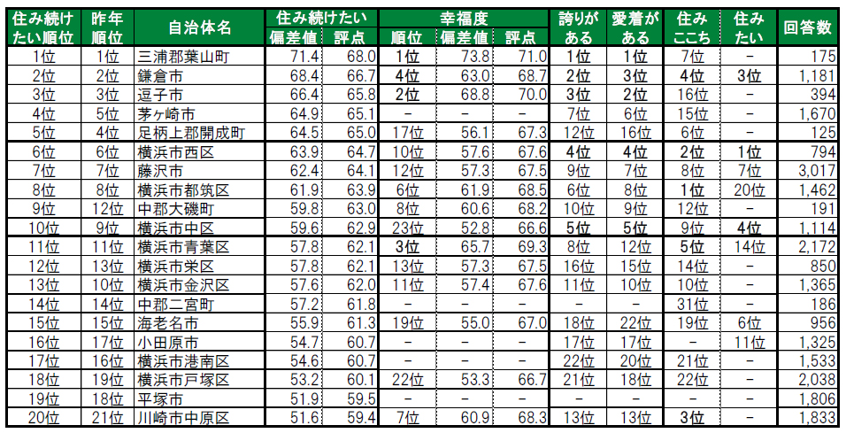 ※昨年順位を「ー」と表示しているのは、自治体で回答者数が50名未満、駅で30名未満など集計の規定に満たない場合、または偏差値が50未満で順位を公表していない場合です。