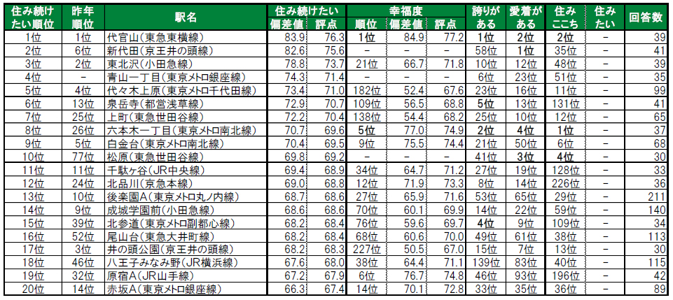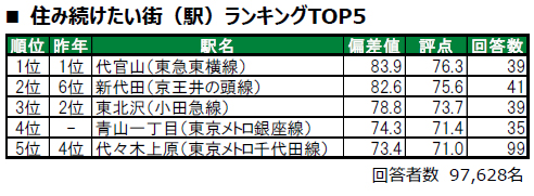 渋谷区に位置する代官山が、4年連続での1位に輝きました。2位は世田谷区に位置する新代田で、昨年6位から順位を上げました。トップ2の駅は、偏差値80台の極めて高い評価を得ています。3位は、世田谷区に位置する東北沢です。4位の港区に位置する青山一丁目は今回初登場の駅で、昨年は累計回答数が30名未満でランキング集計対象外でした。