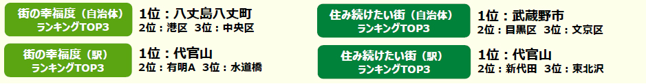 ※「街の幸福度(駅)・住み続けたい街(駅)」は、駅徒歩15分以内に居住している回答者が30名以上の駅を、「街の幸福度(自治体)・住み続けたい街(自治体)」は、回答者50名以上の自治体を対象として集計しています。