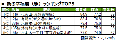 ■街の幸福度(駅)トップは、4年連続で代官山