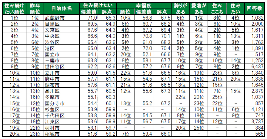 1位は3年連続で武蔵野市で、唯一偏差値70台の高い評価を得ており、「街に愛着がある」でも1位となっています。2位も、3年連続で目黒区です。3位は文京区で、「住みここち」をはじめとする全てのランキングでトップ5以内に入る評価を得ています。