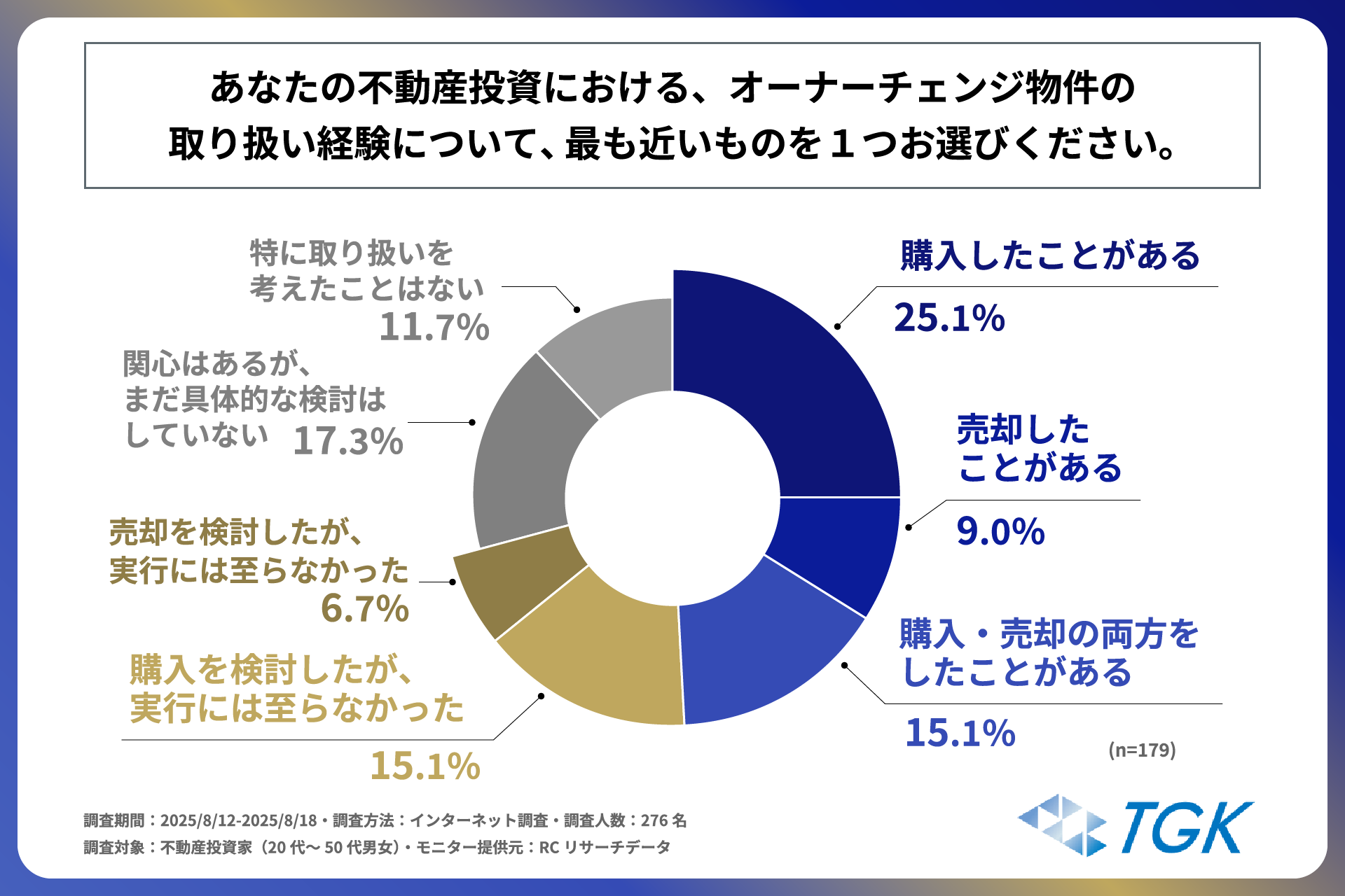 次に、オーナーチェンジ物件という言葉を知っている(詳しく知っている、なんとなく意味もわかる)と回答した人を対象に「不動産投資における、オーナーチェンジ物件の取り扱い経験」を尋ねる設問への回答では、1位が「購入したことがある」で25.1%、2位が「関心はあるが、まだ具体的な検討はしていない」で17.3%、3位が同率で「購入・売却の両方をしたことがある」と「購入を検討したが、実行には至らなかった」で15.1%という結果になりました。1位の「購入したことがある(25.1%)」という回答と3位の「購入・売却の両方をしたことがある(15.1%)」という回答を合計すると回答率40%以上となり、この結果から、オーナーチェンジ物件という言葉を知っている不動産投資家の4割以上が、オーナーチェンジ物件の購入経験があることがわかりました。