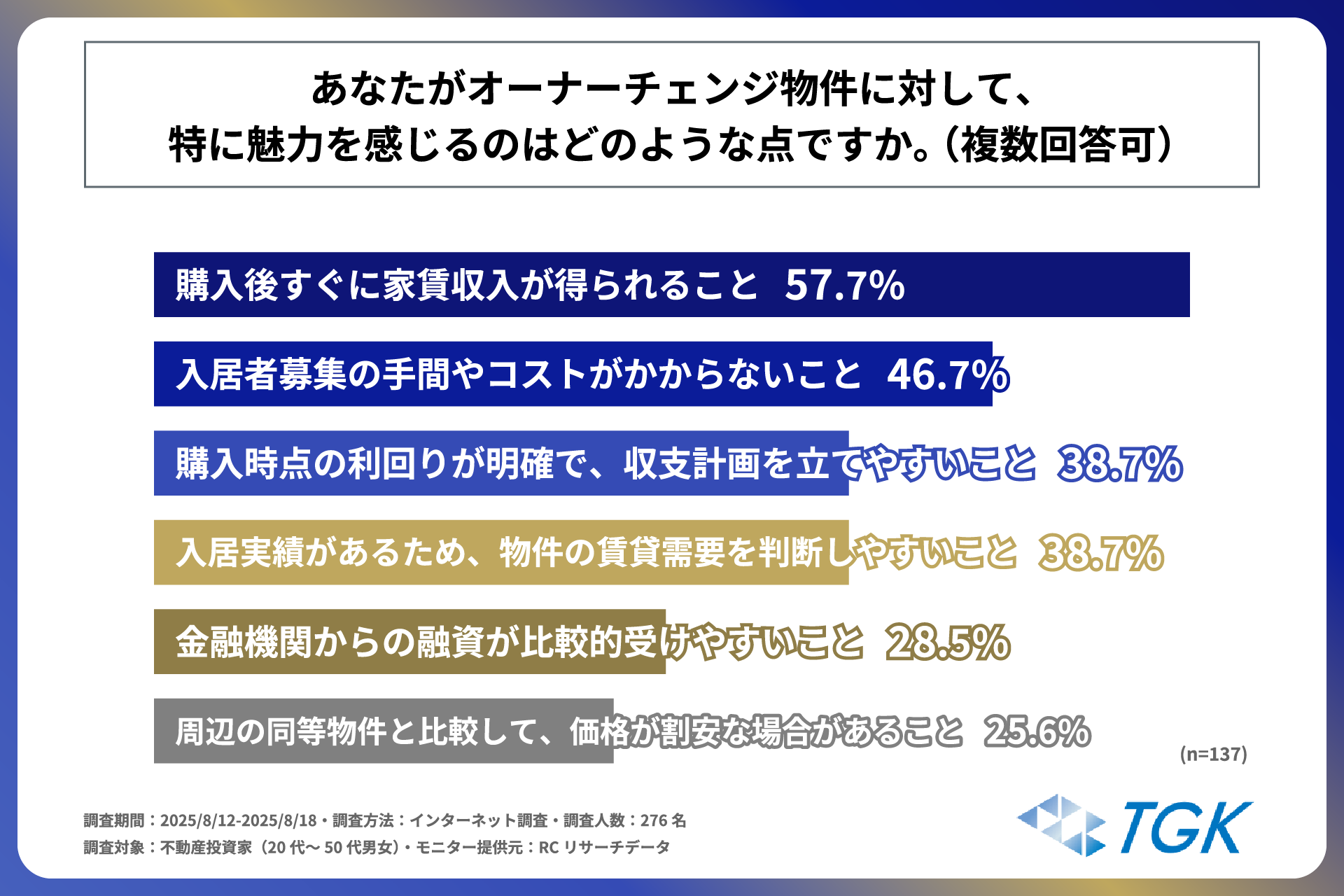 また、オーナーチェンジ物件購入に魅力を感じる(魅力を感じる、とても魅力を感じる)と回答した人を対象に「オーナーチェンジ物件に対して、特に魅力を感じる点」を尋ねる設問への回答では、1位が「購入後すぐに家賃収入が得られること」で57.7%、2位が「入居者募集の手間やコストがかからないこと」で46.7%という結果になりました。この結果から、オーナーチェンジ物件購入に魅力を感じる人が、特に魅力を感じている点は「購入後すぐに家賃収入が得られること」であることが明らかになりました。