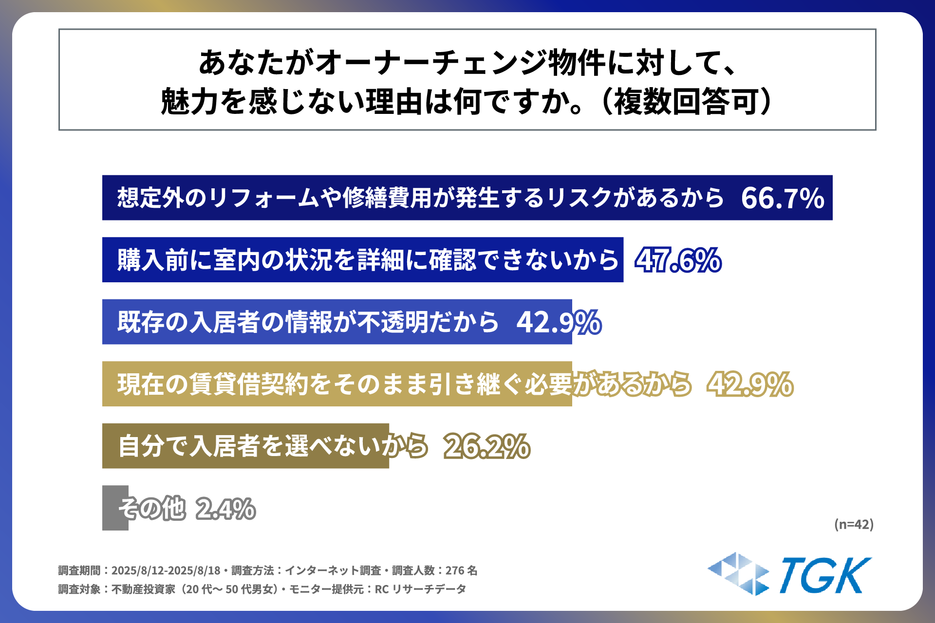 ・オーナーチェンジ物件購入に魅力を感じない人の主な理由は、「想定外のリフォームや修繕費用が発生するリスクがあるから」や「購入前に室内の状況を詳細に確認できないから」