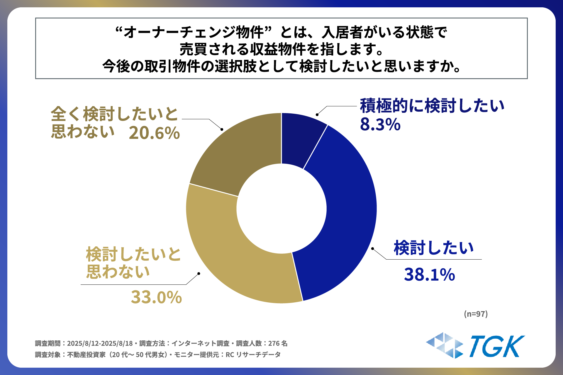 調査の最後、オーナーチェンジ物件を知らない(意味はよくわからない、全く知らない)と回答した人を対象に、”オーナーチェンジ物件”とは、入居者がいる状態で売買される収益物件を指すことを伝えたあと、「”オーナーチェンジ物件”を今後の取引物件の選択肢として検討したいと思うか」を尋ねた設問への回答では、1位が「検討したい」で38.1%、2位が「検討したいと思わない」で33.0%、3位が「全く検討したいと思わない」で20.6%、4位が「積極的に検討したい」で8.3%という結果になりました。1位と4位の回答を合計すると回答率45%を超える形となり、この結果から、オーナーチェンジ物件を知らないと回答した不動産投資家の45%以上が、オーナーチェンジ物件の意味を知ったあと、今後の取引物件の選択肢としてオーナーチェンジ物件を少なからず検討したいと考えていることが明らかになりました。