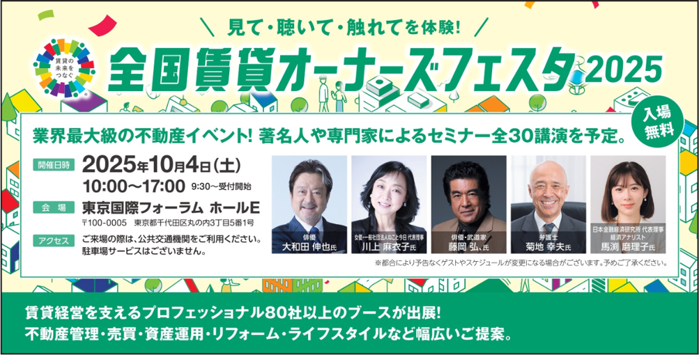 株式会社エイブル(本社:東京都港区、以下エイブル)は、賃貸オーナー様や不動産投資家などを対象とした「全国賃貸オーナーズフェスタ2025」を、2025年10月4日(土)に東京国際フォーラムにて過去最大規模で開催いたします。