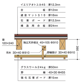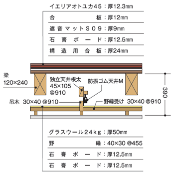 『イエリアオトユカ45』+『遮音マットS18』 『イエリアオトユカ45』+『遮音マットS09』+『防振ゴム天井M』