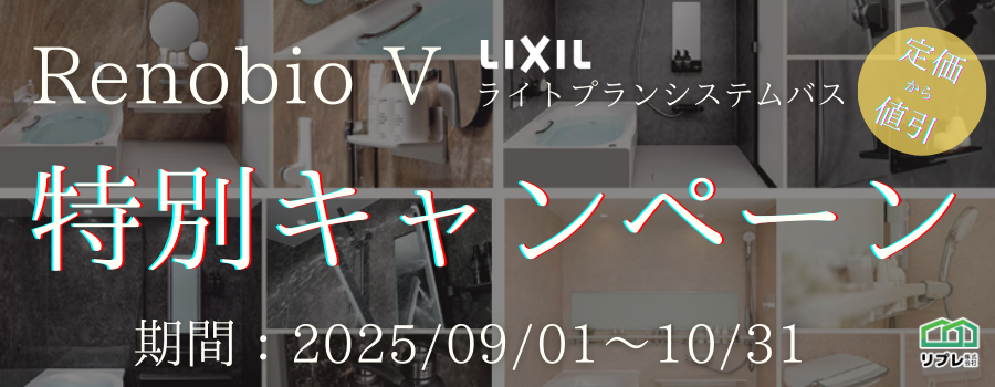 リプレ株式会社(本社:大阪市中央区、代表:古川 賢)は、2025年9月1日(月)より、期間限定でLIXILのライトプランシステムバス「Renobio V(リノビオV)」の特別キャンペーンを実施いたします。 期間中に「Renobio V(リノビオV)」をご契約いただき、工事が完了されたお客様は商品代を定価50,000円値引きでご提供いたします。