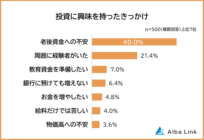 投資に興味がある社会人500人に「投資に興味を持ったきっかけ」を聞いたところ、圧倒的な1位は「老後資金への不安(40.0%)」でした。