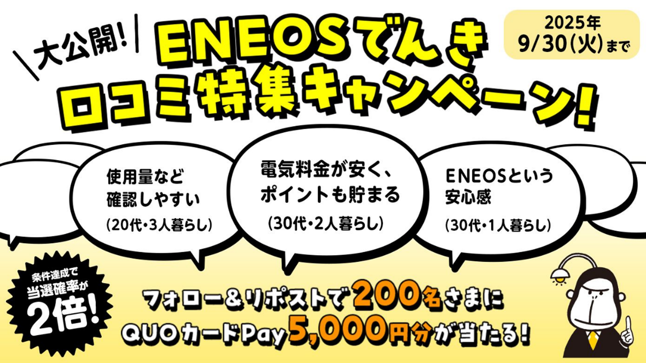ENEOSでんきでは、ご利用中のお客さまからお寄せいただいた「生の声」を、口コミ特集記事として公開しました。ENEOSでんき公式Xアカウントをフォローのうえ、対象の投稿をリポストいただくと、抽選で200名さまにQUOカードPay 5,000円分をプレゼントいたします。※1