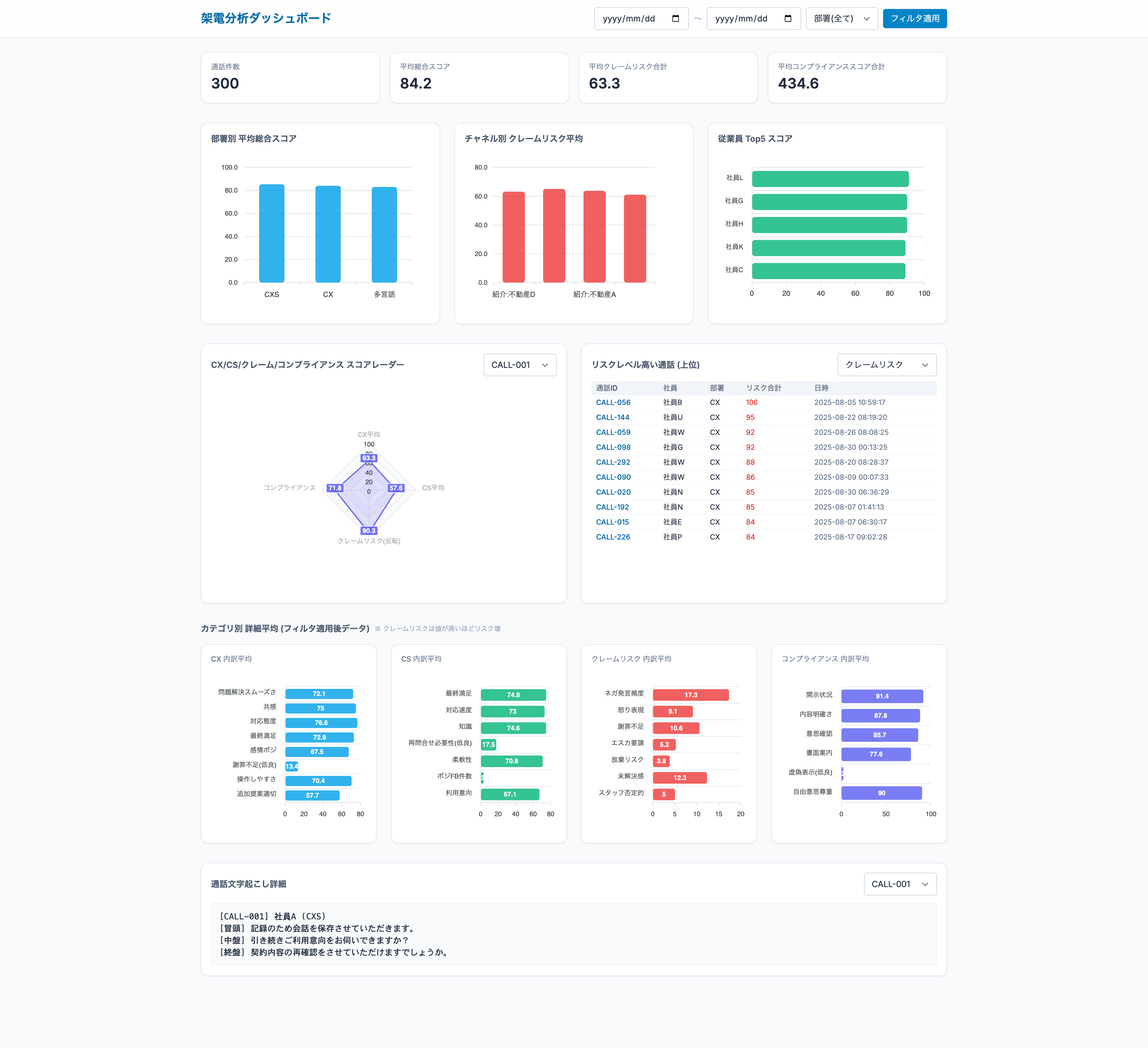本システムにより、これまで人手不足で困難だった通話記録の全件チェックが可能となり、顧客対応品質の大幅な改善を実現しています。