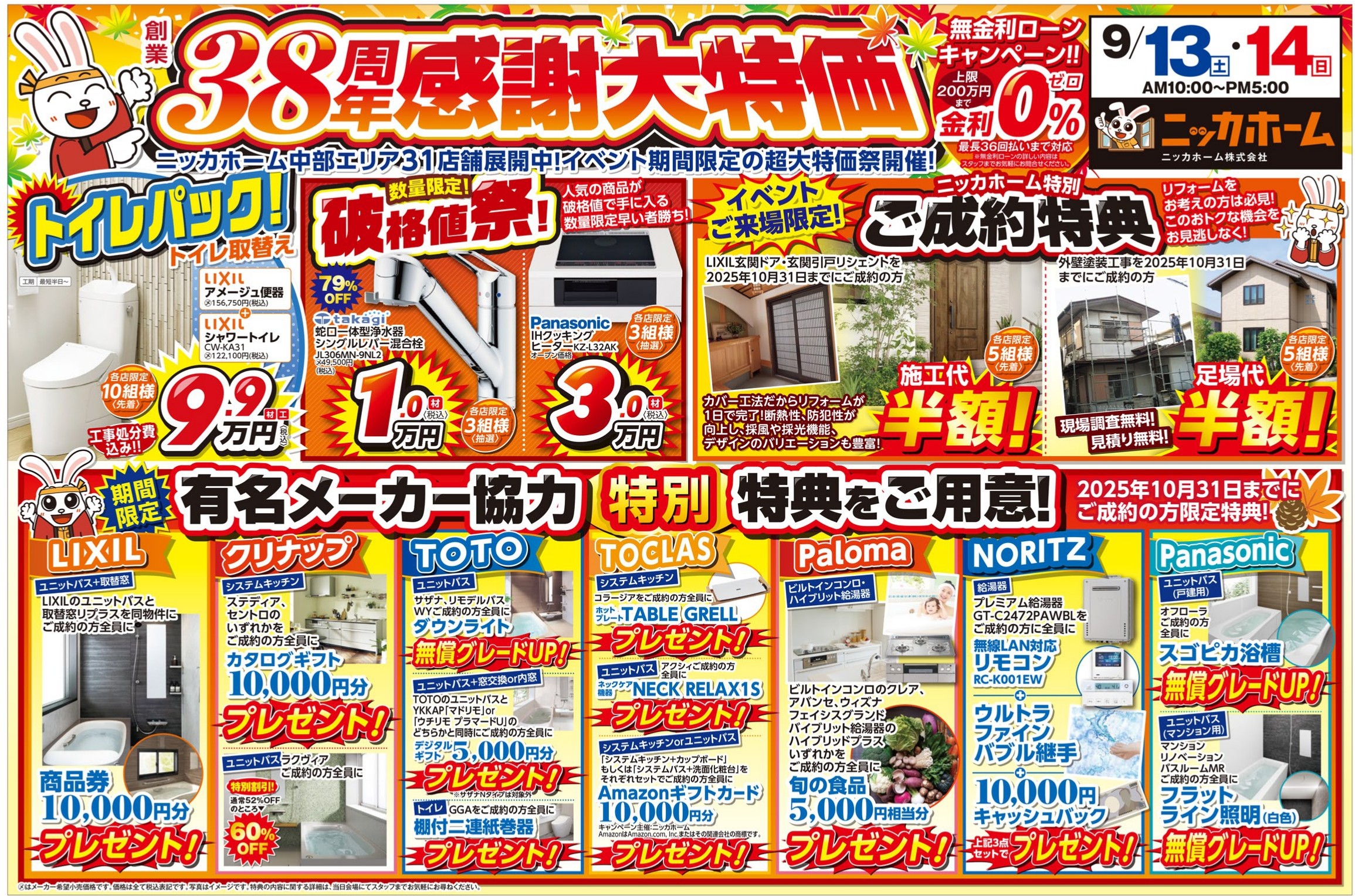 さらに、対象の水廻り設備をご成約頂いた方には、仕様のグレードアップやオプション品プレゼントなど各メーカーごとに嬉しい特典をご用意しております。詳しくはチラシ裏面をご覧ください。