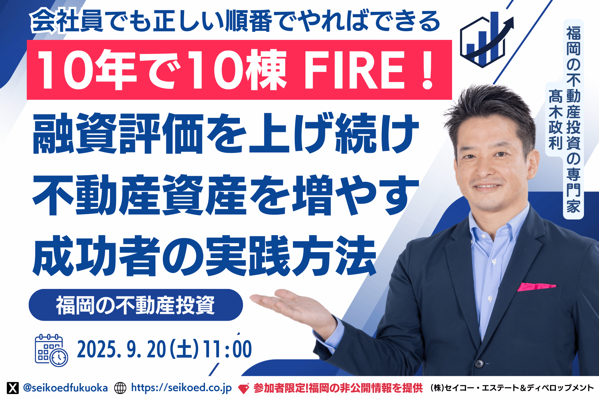 株式会社セイコー・エステート&ディベロップメント(本社:福岡市、代表取締役:髙木政利)は、2025年9月20日(土)に【会社員でも“最短で10棟・FIRE”を目指す福岡の不動産投資戦略セミナー】を開催します。