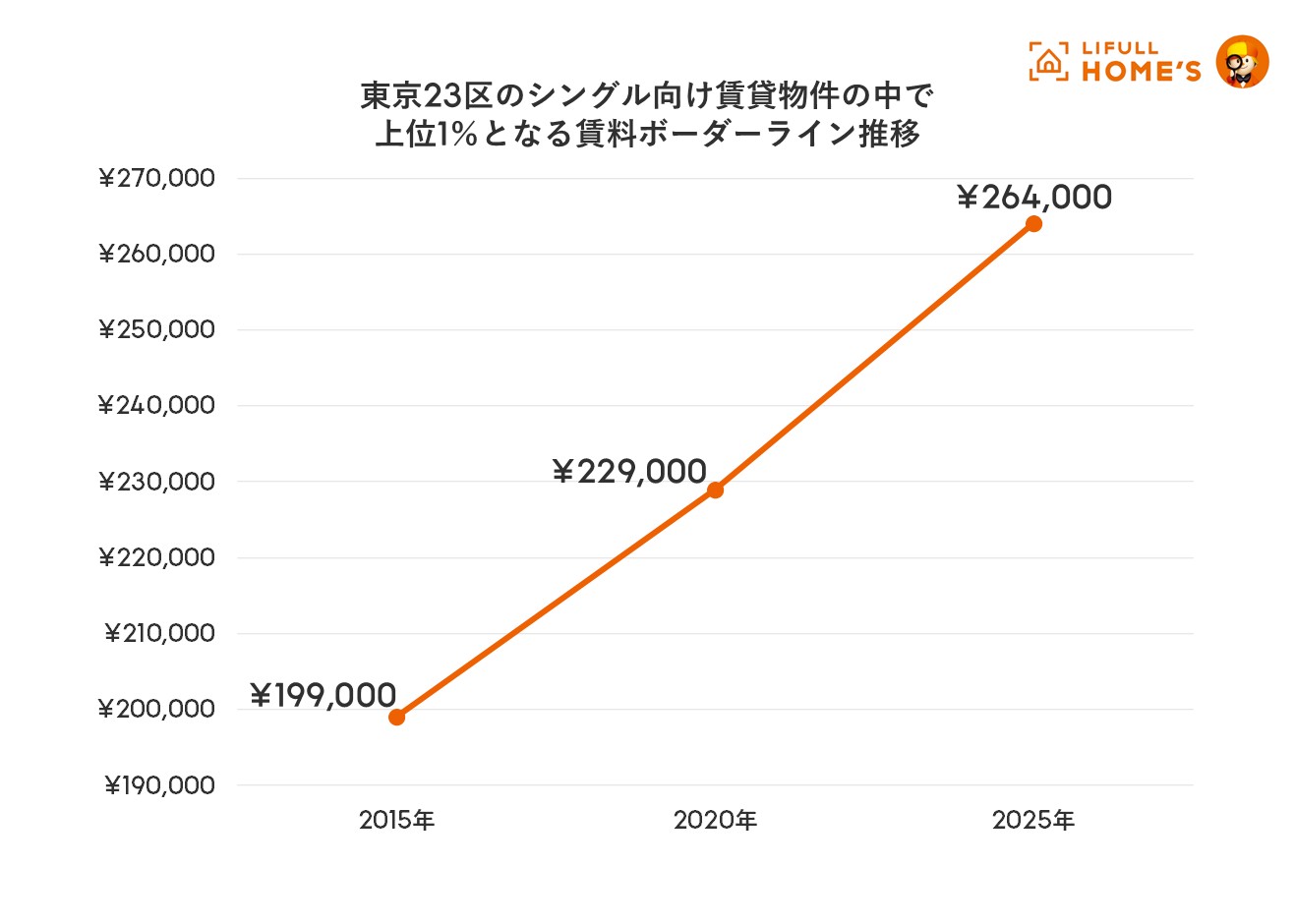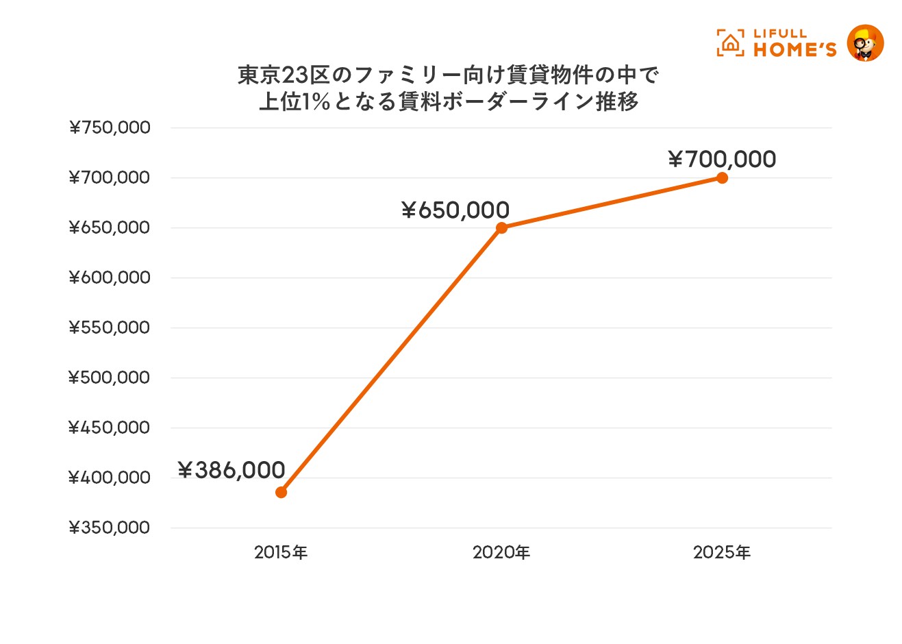 23区の賃料上位1%のボーダーラインとなる金額の推移を調査したところ、シングル向け物件では2015年は199,000円と20万円を切っていましたが、2025年には264,000円となり、10年で約1.3倍となっています。ファミリー向け物件では、2015年は386,000円でしたが2025年には700,000円と約1.8倍となり、10年で314,000円も上昇しています。