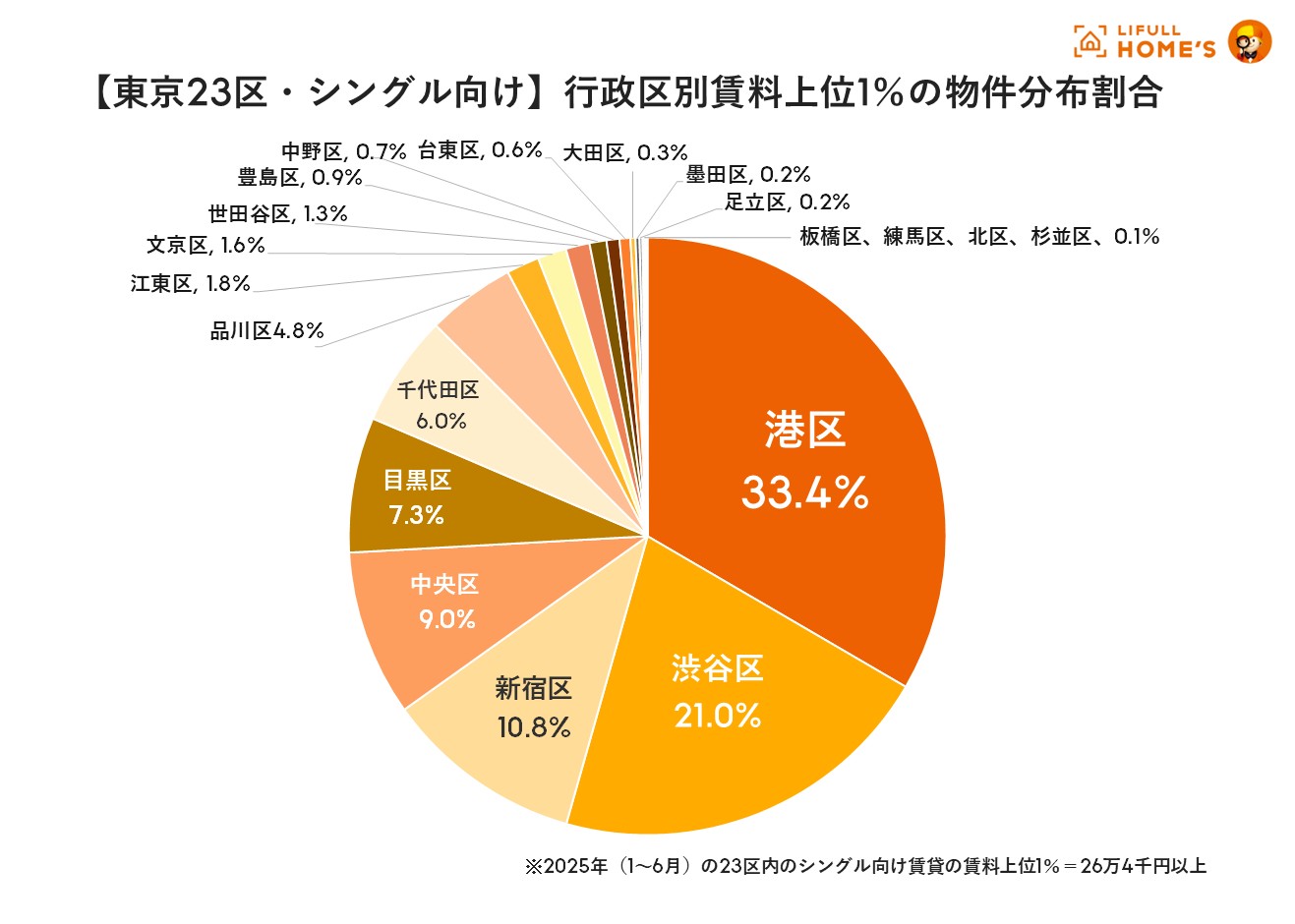 事業を通して社会課題解決に取り組む、株式会社LIFULL(ライフル)(本社:東京都千代田区、代表取締役社長:伊東祐司、東証プライム:2120、以下「LIFULL」)が運営する不動産・住宅情報サービス「LIFULL HOME’S(ライフルホームズ)」は、東京23区の賃料上位1%の水準と分布エリアシェアについて調査しました。