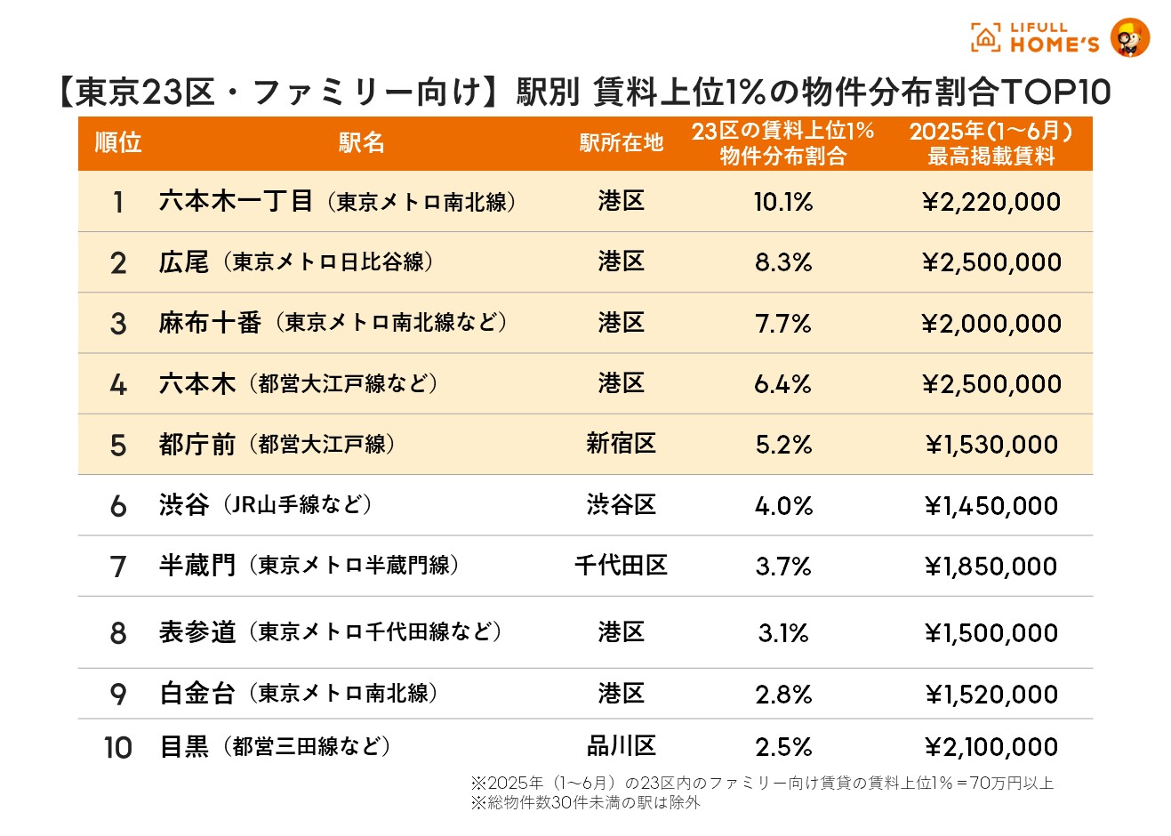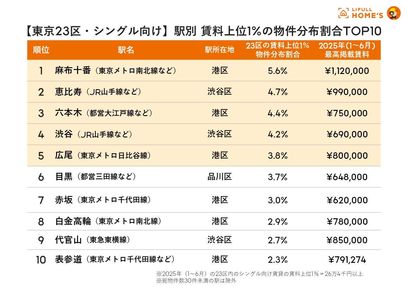 23区の賃料上位1%にあたる賃貸物件の分布割合を最寄り駅別にランキング化したところ、シングル向け物件では「麻布十番」(5.6%)、ファミリー向け物件では「六本木一丁目」(10.1%)がトップとなりました。