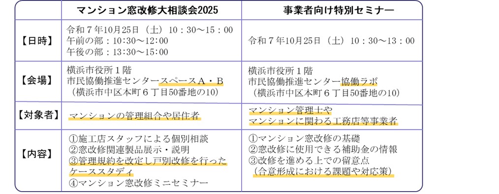このたび、室内の暑さ・寒さ対策、冷暖房費削減、結露防止に効果があるマンションの窓改修に関する「居住者向け相談会」と「事業者向けセミナー」を令和7年10月25日(土)に同日開催します!
