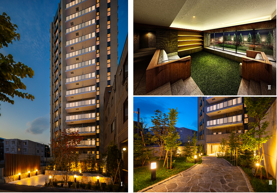 建物は地上15階建・全42邸。柔らかなベージュを基調に、ダークトーンやガラスの質感を織り交ぜた直線的なフォルムを採用し、気品漂う洗練の佇まいを演出します。敷地入口からエントランスにかけては、私邸感を醸す伸びやかなアプローチを設えました。左右には季節ごとに様々な顔を見せる植栽を配置し、緑の潤いを身近に感じさせます。エントランスを抜けると、歓談の場となるラウンジが迎えます。ゆったりとしたソファを置き、住民同士のコミュニケーションを育む安らぎの場となるよう設計しています。