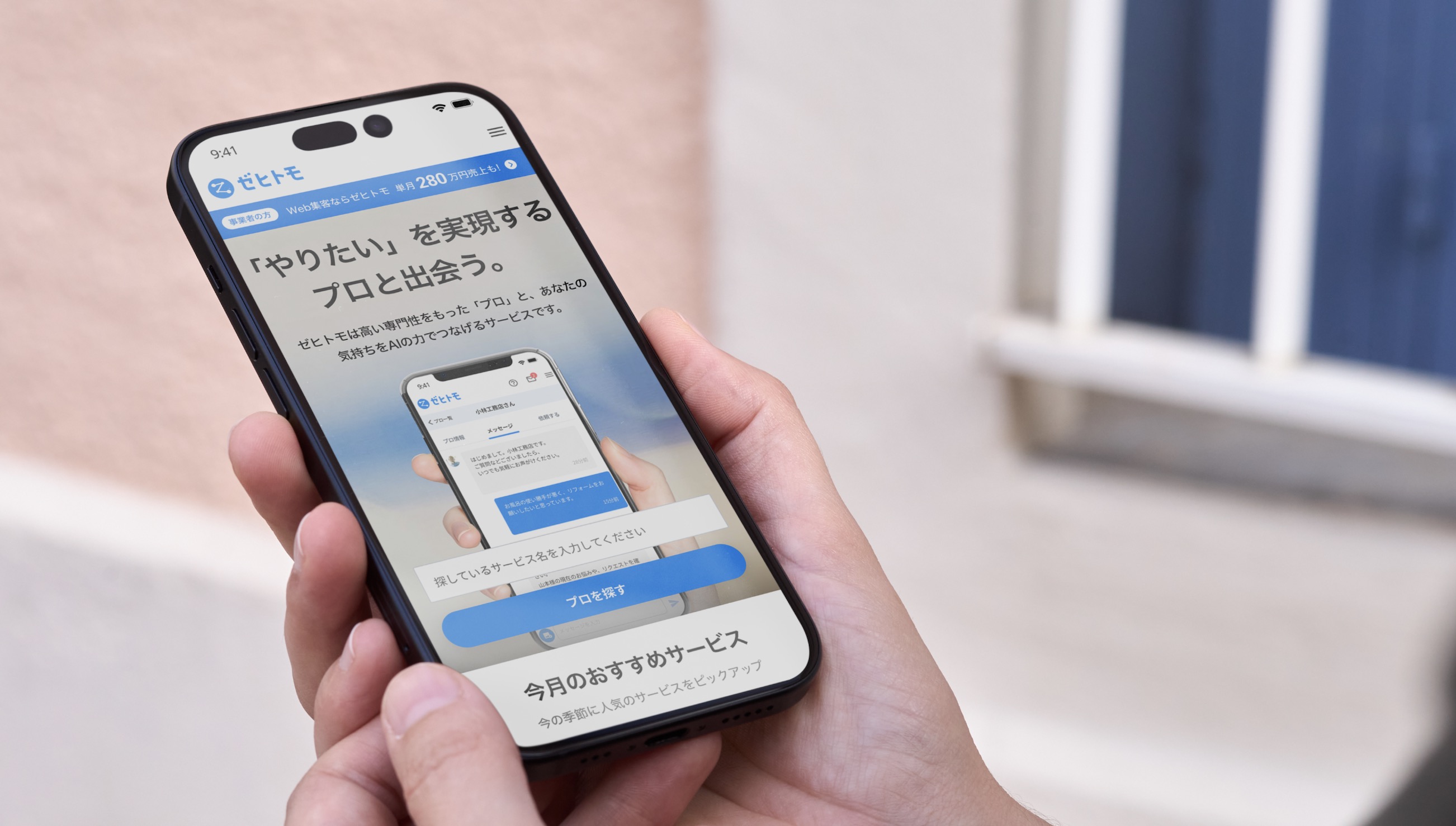 ゼヒトモは、仕事をお願いしたい依頼者と、カメラマン、ヨガ講師、リフォームや工事事業者などさまざまな「プロ」をつなぐプラットフォームです。プロの仕事の幅や可能性を広げ、日本のローカルサービス、そして働き方を変えていきます。仕事をお願いしたい依頼者が条件を指定すると、AIがオーダーに合った事業者とマッチング。ゼヒトモのプラットフォーム上でのチャットだけでなく、事業者と直接電話やEメールなどを使って連絡を取ることもできます。
