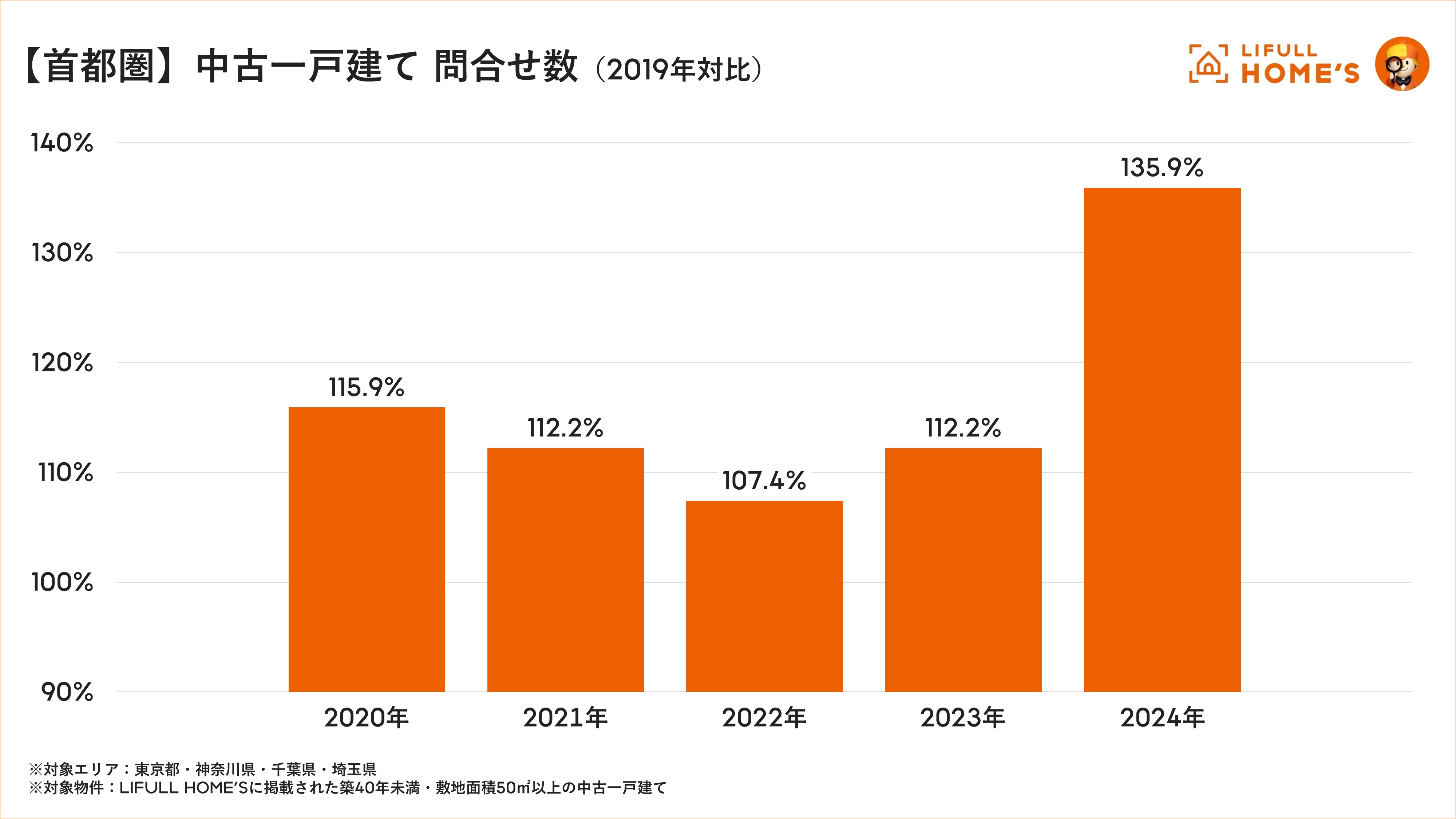 LIFULL HOME’Sに掲載された中古一戸建て(築40年未満・敷地面積50㎡以上)の問合せ数を調査したところ、2024年の問合せ数は2019年と比較して135.9%となり、大きく増加しました。