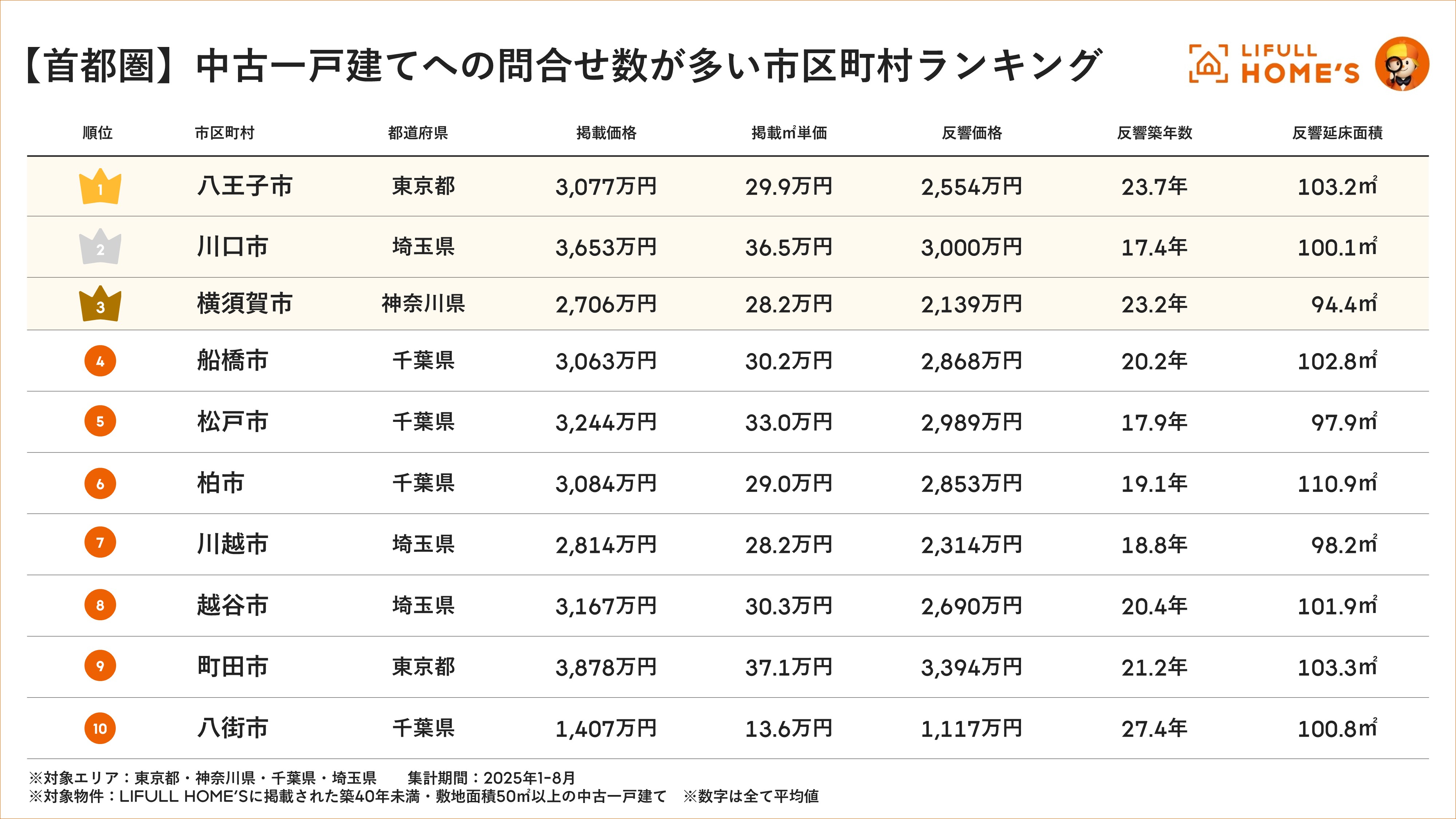 2025年1-8月における、LIFULL HOME’Sに掲載された首都圏の中古一戸建てへの「問合せ数」を市区町村別に集計した「中古一戸建てへの問合せ数が多い市区町村ランキング」では、「八王子市(東京都)」が1位となりました。2位には「川口市(埼玉県)」、3位には「横須賀市(神奈川県)」が続いています。一部を除いて、郊外の市区町村が多くランクインする結果となりました。