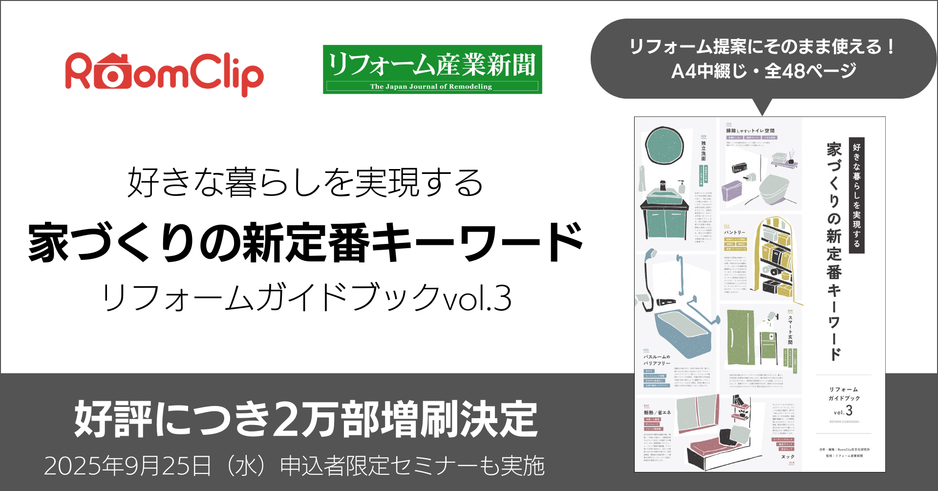 ルームクリップ株式会社(本社:東京都渋谷区、代表取締役CEO:髙重正彦)は、リフォーム産業新聞(本社:東京都中央区、代表取締役社長:加覧光次郎、以下リフォーム産業新聞)と共同で発行する、「好きな暮らしを実現する 家づくりの新定番キーワード リフォームガイドブックvol.3」について、当初20万部に加え2万部を増刷し、合計22万部とすることを決定いたしました。