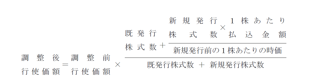 また、本新株予約権の割当日後、当社が当社普通株式につき時価を下回る価額で新株の発行または自己株式の処分を行う場合(新株予約権の行使に基づく新株の発行及び自己株式の処分並びに株式交換による自己株式の移転の場合を除く。)、次の算式により行使価額を調整し、調整による1円未満の端数は切り上げる。