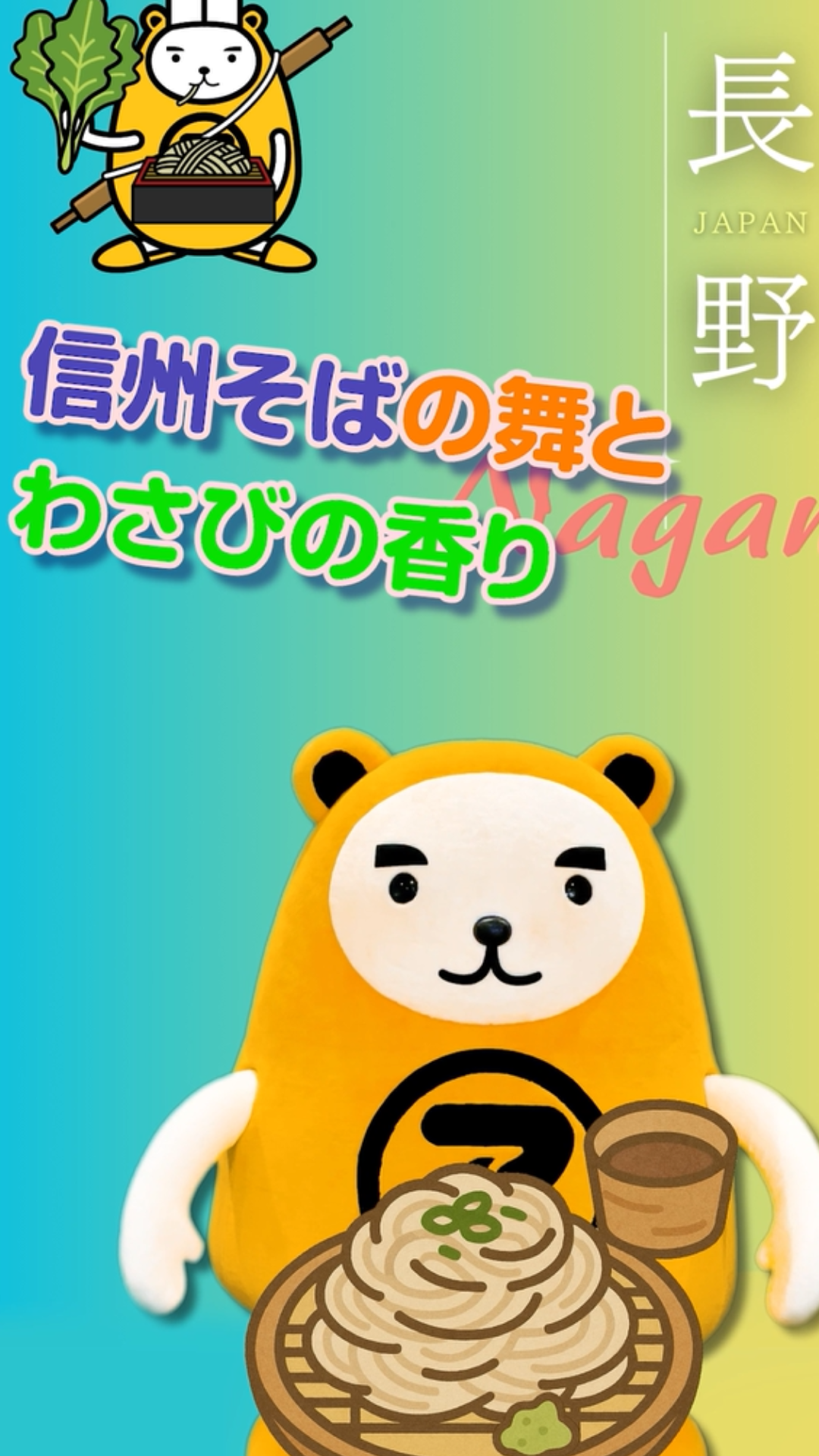 長野県を代表する名産品である「信州そば」と「本わさび」の魅力をテーマに、べあ~君がキレのある動きと愛らしい表情で軽快に踊ります。そばを作る仕草や、わさびの香りにちょっぴり驚く表情など、食文化をユーモラスに表現した振付が見どころです。両手をリズミカルに広げながらそばを手繰る様子や、ピリッとくるわさびを表現したリアクションの動きが、長野ならではの「味わい深い暮らし」を体現しています。