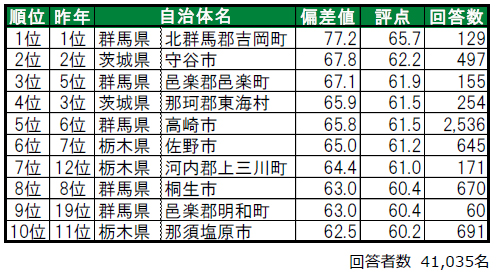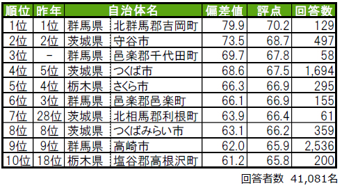 群馬県北群馬郡吉岡町が唯一偏差値70台の高い評価を得て、2年連続で1位です。2位は、3年連続で茨城県守谷市です。3位は、昨年5位から順位を上げた群馬県邑楽郡邑楽町です。その他、トップ10内では、7位栃木県河内郡上三川町(かわちぐん かみのかわまち)(昨年12位)、9位群馬県邑楽郡明和町(めいわまち)(昨年19位)、10位栃木県那須塩原市(昨年11位)が、昨年から順位を上げてトップ10入りしています。