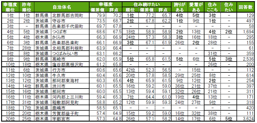 街の幸福度は2年連続で1位群馬県北群馬郡吉岡町、2位茨城県守谷市。3位は初トップ3入りの邑楽郡千代田町。