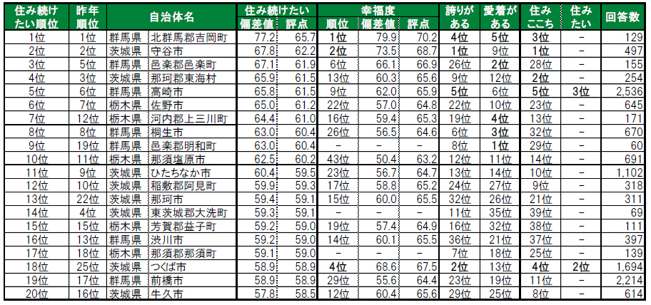住み続けたい街の1位は2年連続で群馬県北群馬郡吉岡町。2位は3年連続で茨城県守谷市。3位群馬県邑楽郡邑楽町。