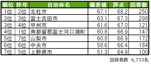 北杜市が昨年2位から順位を上げて、1位に輝きました。北杜市は、「街の幸福度」をはじめとする全てのランキングでトップ10内に入る高い評価を得ている街です。2位は富士吉田市(昨年3位)、3位は甲州市(昨年4位)で、いずれも昨年から順位を上げてトップ3入りしています。