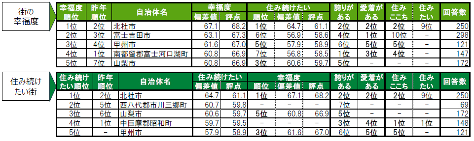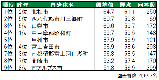 「街の幸福度」でも1位の北杜市が、「住み続けたい街」でも1位に輝きました。2位は西八代郡市川三郷町(昨年5位)、3位は山梨市(昨年6位)で、いずれも昨年から順位を上げてトップ3入りしています。トップ9内では、5位に甲州市が昨年ランク外からトップ5にランクインしています(昨年は偏差値50未満のため順位非公開)。
