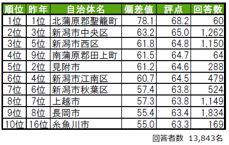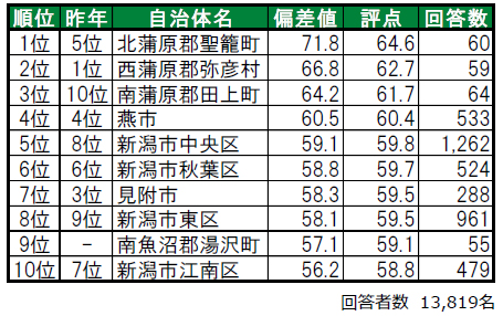 北蒲原郡聖籠町が昨年5位から順位を上げ、唯一偏差値70台の高い評価を得て1位です。2位は、西蒲原郡弥彦村です。3位は、昨年10位から大きく順位を上げた南蒲原郡田上町です。トップ3は、全て郡部に属する「町」や「村」という結果になっています。その他、トップ10内では、9位に南魚沼郡湯沢町が昨年ランク外から今年は上位にランクインしています(昨年は偏差値50未満のため順位非公開)。