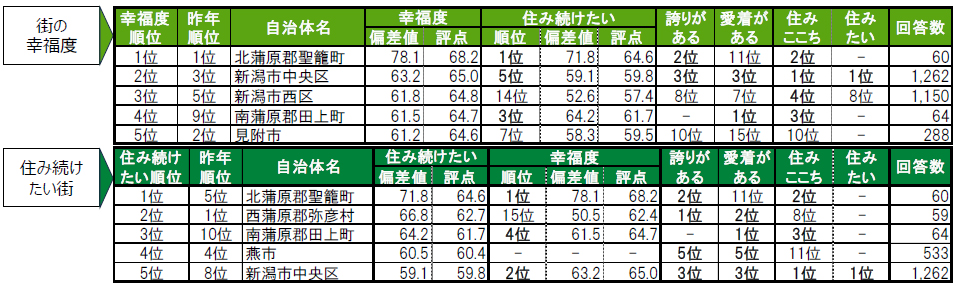 街の幸福度の1位は2年連続で北蒲原郡聖籠町。2位新潟市中央区、3位新潟市西区。