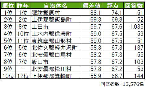 1位は3年連続で諏訪郡原村で、唯一偏差値80台の極めて高い評価を得ています。2位も、3年連続で上伊那郡飯島町です。3位は上田市で、昨年8位から順位を上げました。トップ10内では、5位東筑摩郡山形村(ひがしちくまぐん やまがたむら)(昨年11位)、9位北安曇郡松川村(きたあづみぐん まつかわむら)(昨年は偏差値50未満のため順位非公開)、10位上伊那郡箕輪町(かみいなぐん みのわまち)(昨年12位)が、昨年より順位を上げてトップ10入りしています。
