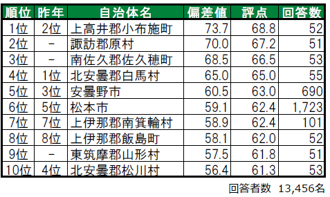 上高井郡小布施町が昨年2位から順位を上げて1位です。2位は諏訪郡原村、3位は南佐久郡佐久穂町で、いずれも今回初登場の自治体です。その他トップ10内で初登場の自治体は、9位の東筑摩郡山形村(ひがしちくまぐん やまがたむら)です。2位・3位・9位の3自治体は、昨年は累計回答者数が50名未満でランキングの集計対象外でした。