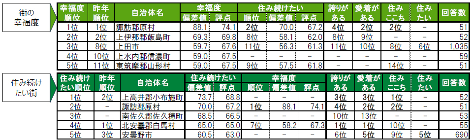 街の幸福度の1位は3年連続で諏訪郡原村。2位も3年連続で上伊那郡飯島町。3位上田市。