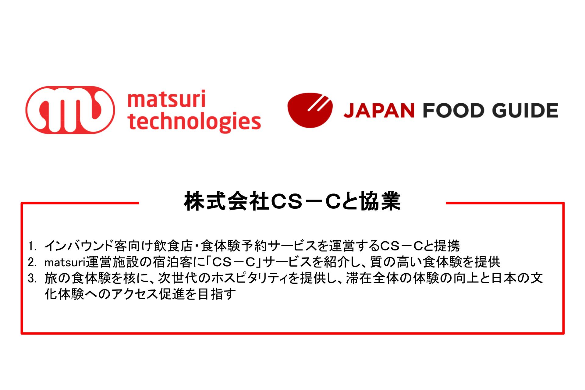 ソフトウェアを主軸に、空間の価値を最大化するソリューション「StayX」を運営するmatsuri technologies株式会社(本社:東京都新宿区)は、インバウンド客向け飲食店・食体験予約サービス「JAPAN FOOD GUIDE」を運営する株式会社CS-C(本社:東京都港区)と送客支援に関して協業したことをお知らせいたします。