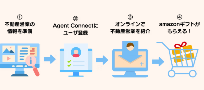 本キャンペーンは、Agent Connectの既存ユーザー様、またはAgent Connectにご興味をお持ちのユーザーの皆様が対象です。「契約前の説明が丁寧だった」「対応が迅速だった」など過去に相談に乗ってもらった、または取引のあった不動産エージェントの情報をAgent Connectにご登録頂きますと、ご紹介者様へ感謝の意を込めてAmazonギフト券を進呈いたします。