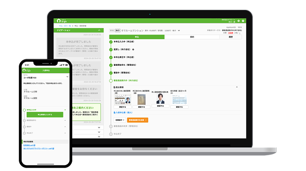 初見でも直感的でわかりやすいデザイン設計。お部屋を借りる方、お部屋のオーナー様、仲介会社様、管理会社様など多くの関係者が関わる賃貸取引の申込/契約で現在の対応状況など、次のアクションが一目でわかるナビゲーション機能や同一画面で関係者とチャットができる機能を搭載