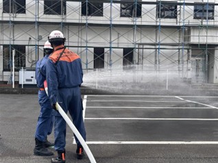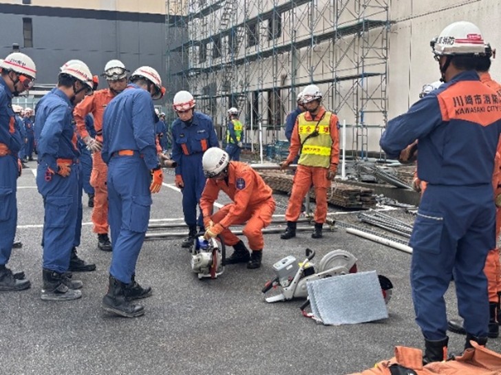 9月7日(日)には、中原消防署と中原消防団の合同訓練が行われ、エンジンカッターでのガードレールの破壊訓練やホース延長を含む消火訓練等、稼働中のビルでは実施できない実践的な防災訓練を実施しました。計40名が参加し、災害発生時の実践力および連携力の向上に取り組みました。