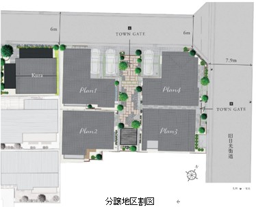 4邸の分譲地の東側は旧日光街道に、北側は道幅6mの前面道路に面しています。隣接する油長内蔵が、和の佇まいの印象をより一層強調しています。