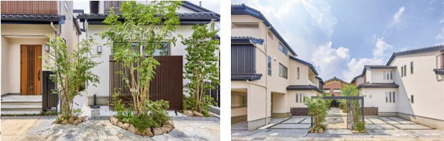 それぞれの住まいには街並みに調和するデザインの外構素材に加えて、格子のフェンスや植栽を計画的に配置。柔らかく空間を区切りながら共有地のアクセントとしても効果を発揮します。