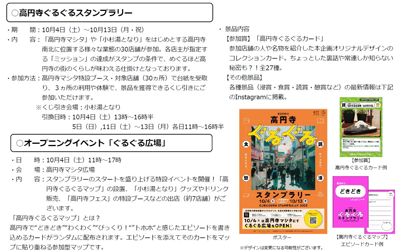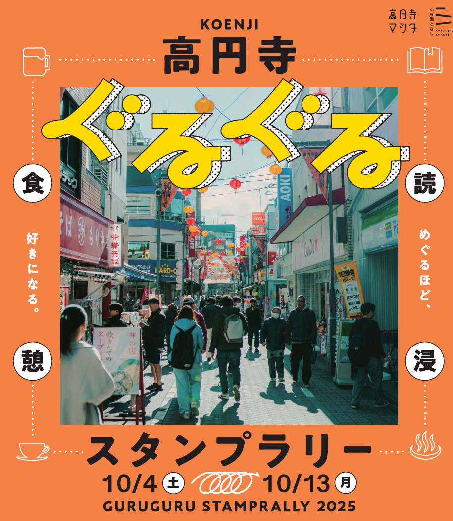 ホームイベントぐるぐる高円寺 〜めぐるほど、この街が好きになる。〜 イベント ぐるぐる高円寺 〜めぐるほど、この街が好きになる。〜 By レジデンスONLINE 編集部 2025年9月19日 0 38 シェア FacebookTwitterPinterestWhatsApp 高円寺駅周辺に拠点を置き、鉄道高架下・銭湯という異なる切り口からくらしづくり・まちづくりに取り組む「高円寺マシタ」(運営:株式会社ジェイアール東日本都市開発)と「小杉湯となり」(運営:株式会社銭湯ぐらし)が、今年も「高円寺のまちのくらしを楽しむ」をコンセプトに、コラボイベントを開催いたします。スタンプラリーを通して回遊し、魅力あふれる人や店舗と接し、沢山の思い出を重ね高円寺という街をさらに好きになってほしいという思いで企画しました。 Tagsスタンプラリー小杉湯株式会社ジェイアール東日本都市開発高円寺高円寺マシタ高架下 シェア FacebookTwitterPinterestWhatsApp 前の記事横浜・仲町台に誕生する新築分譲マンション「K HOUSE横浜仲町台」物件サイト公開次の記事東京の最前列に登場する一対のシンボル、地上50階建ての超高層免制震タワー「HARUMI FLAG SKY DUO」竣工 レジデンスONLINE 編集部 RELATED ARTICLES イベント 第2回「ADワークスグループ不動産投資フォーラム」を開催 不動産小口化商品「ARISTO」の最新動向や新商品を解説 2025年12月5日 イベント 2025年12月3日(水)「楓工務店/アイニコグループ視察会 in 奈良」を実施! 2025年12月5日 イベント 高性能ZEH分譲住宅を展開する葛飾区のセイズ、都が表彰する令和7年度「東京エコビルダーズアワード」を3年連続受賞 2025年12月5日 返事を書く 返事をキャンセル コメント: あなたのコメントを入力してください。 名前: ここにあなたの名前を入力してください Eメール: 間違ったメールアドレスを入力しました。 ここにあなたのEメールアドレスを入力してください ウェブサイト: 次回の私のコメントのためにこのブラウザに私の名前、電子メール、そしてウェブサイトを保存してください。 Most Popular 第2回「ADワークスグループ不動産投資フォーラム」を開催 不動産小口化商品「ARISTO」の最新動向や新商品を解説 2025年12月5日 宅建業者向け「AI掲載支援プログラム」を開始 2025年12月5日 AI相続士が誕生! 2025年12月5日 2025年12月3日(水)「楓工務店/アイニコグループ視察会 in 奈良」を実施! 2025年12月5日 もっとロードする Recent Comments