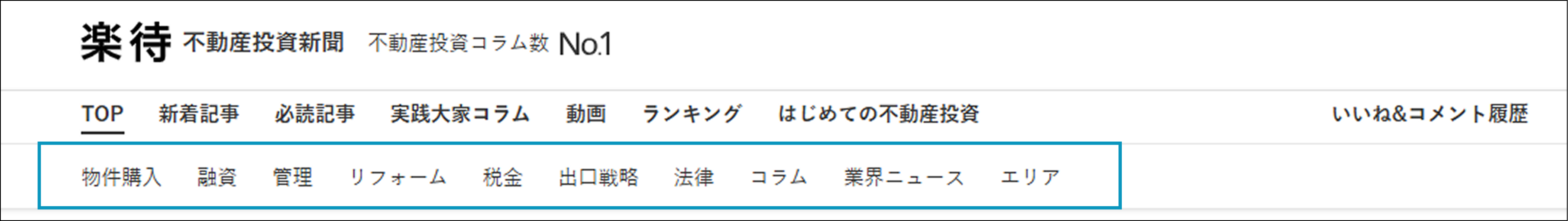 「楽待」サイト内にあるウェブメディア「楽待新聞」は2013年から提供を開始しました。記事やコラムの拡充に伴い、読者から「良い記事があってもたどり着けない」という声が寄せられていました。そこで、トップページから情報設計の見直しを実施。メニューバーに「記事カテゴリ」を追加し、「物件購入」や「業界ニュース」など、よく読まれているカテゴリを上部に常時表示することで、関心のあるテーマから関連記事へすばやくアクセスできるようになりました。