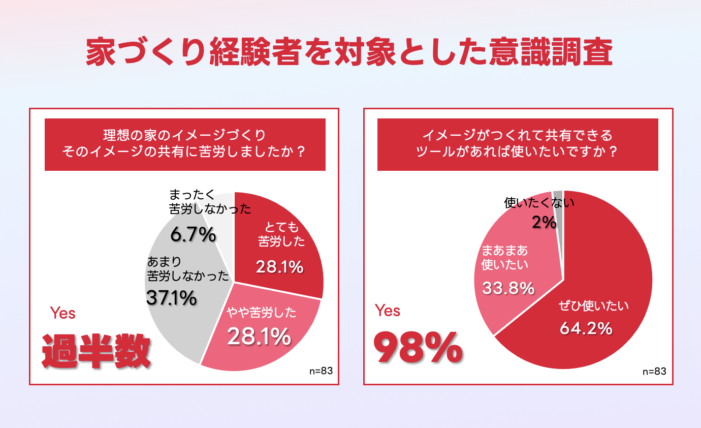 マイホムが2025年4月に実施した調査(※1)では、半数以上が「理想の家のイメージ共有に悩んだ」と回答。また、98%が「家族や工務店とイメージを共有できる機能があれば使いたい」と前向きな意向を示していました。