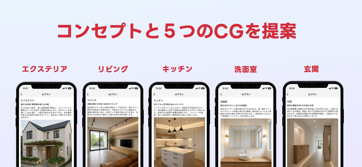 「AIプラン」は、お気に入りの写真(家、ペット、風景など)4枚からユーザーのパーソナリティをAIが分析し、理想の住まいを提案する機能です。外観やリビング、キッチン、洗面所、玄関などをおしゃれにデザインし、完成プランはそのまま住宅会社と共有・相談が可能。イメージのすり合わせに悩まず、スムーズに家づくりの第一歩を踏み出せます。