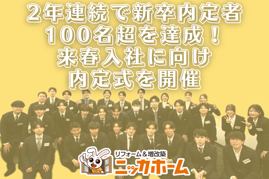 ニッカホームは、25年度新卒の採用で初めて内定者数が100名を突破し、26年度新卒も引き続き大規模採用を実現しました。