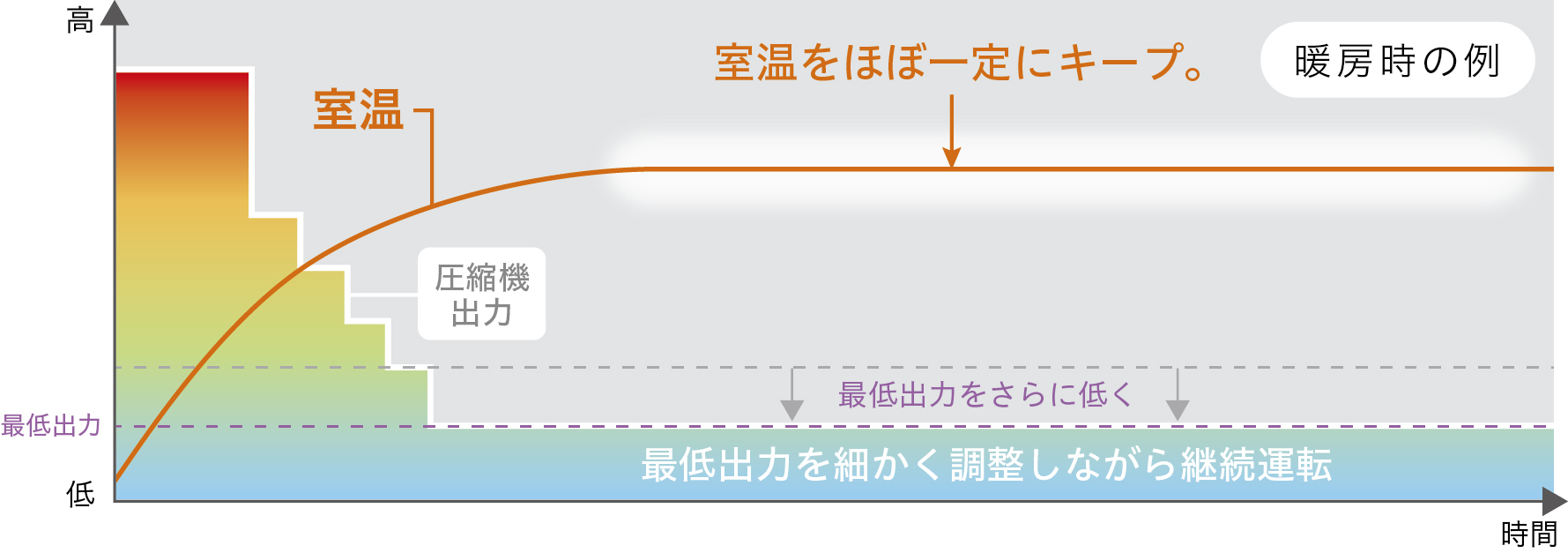 たとえば、暖房時、圧縮機の出力を抑えた運転を継続することで、暖房床面の温度が安定し、お部屋全体の暖かさも長く続きます。